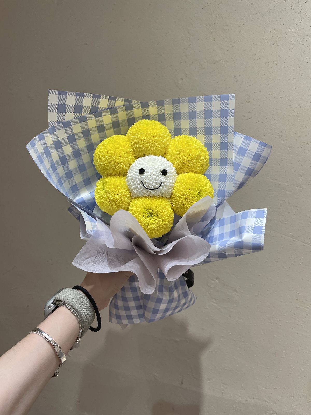 Bé Mặt Trời Cười là sự kết hợp tinh tế giữa vẻ đẹp tự nhiên của hoa cúc Ping Pong và nghệ thuật sắp đặt sáng tạo. Với tông màu vàng rực rỡ, bó hoa không chỉ là món quà trang trí mà còn là biểu tượng của niềm tin và những khởi đầu mới đầy hy vọng. ☀️